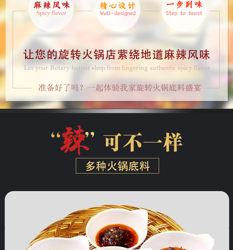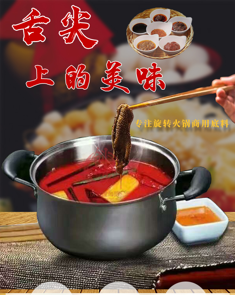 旋轉小火鍋專用底料,口味豐富,品種齊全。主要有:三鮮鍋底,微辣鍋底,麻辣鍋底,香辣鍋底,麻辣牛油鍋底,番茄鍋底,藤椒鍋底,酸湯牛油鍋底,酸菜鍋底,酸辣鍋底,老雞湯鍋底,野生菌湯鍋底,咖喱鍋底等